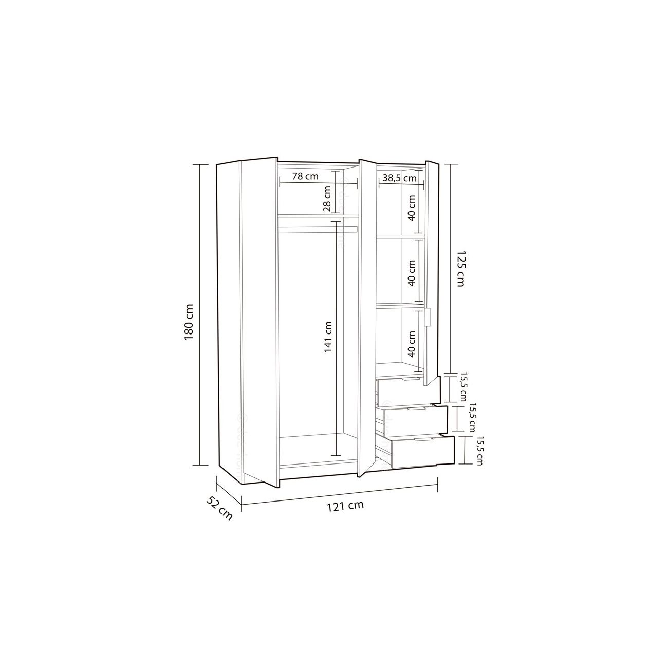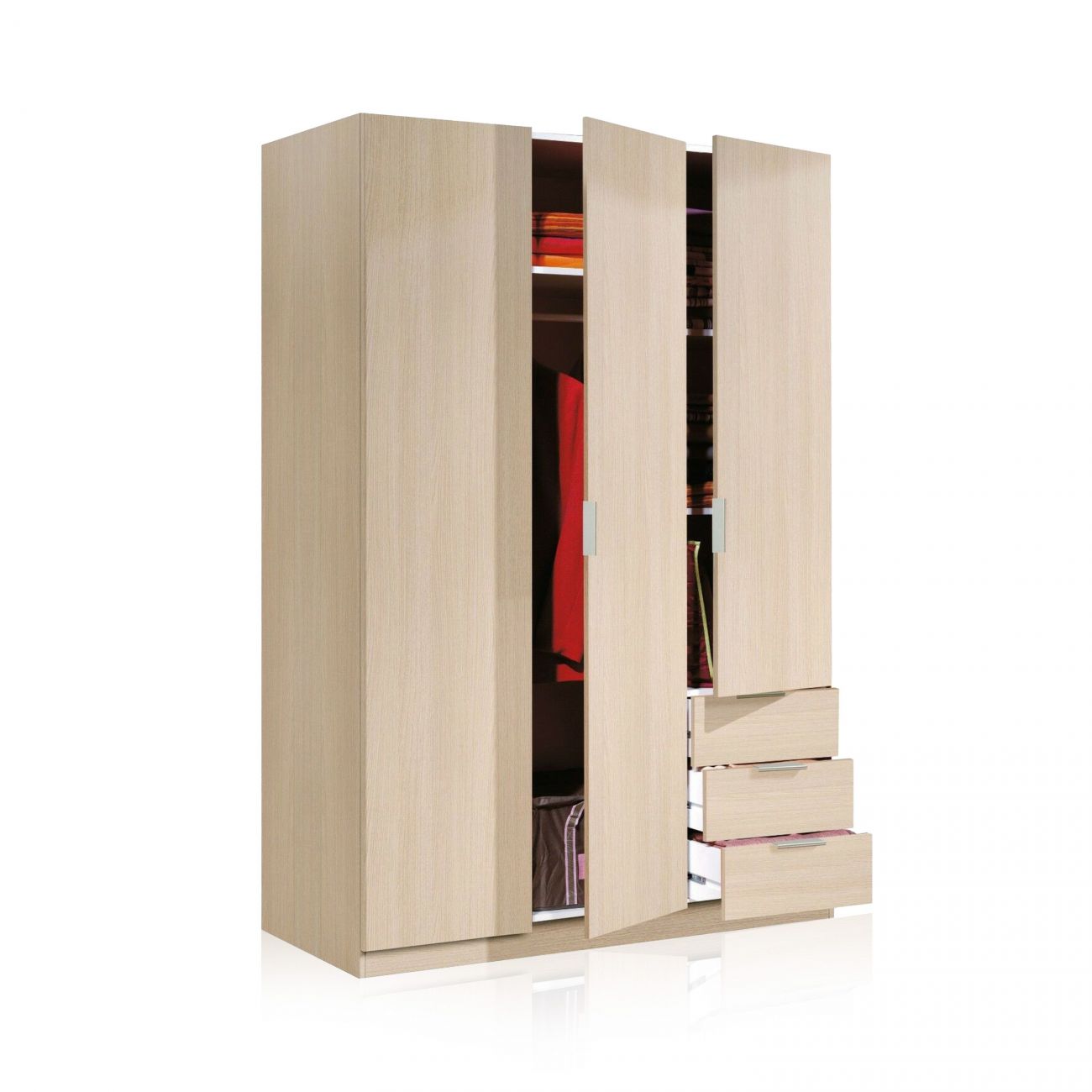 - Roupeiro de tamanho generoso com 3 portas e 3 gavetas não extraíveis