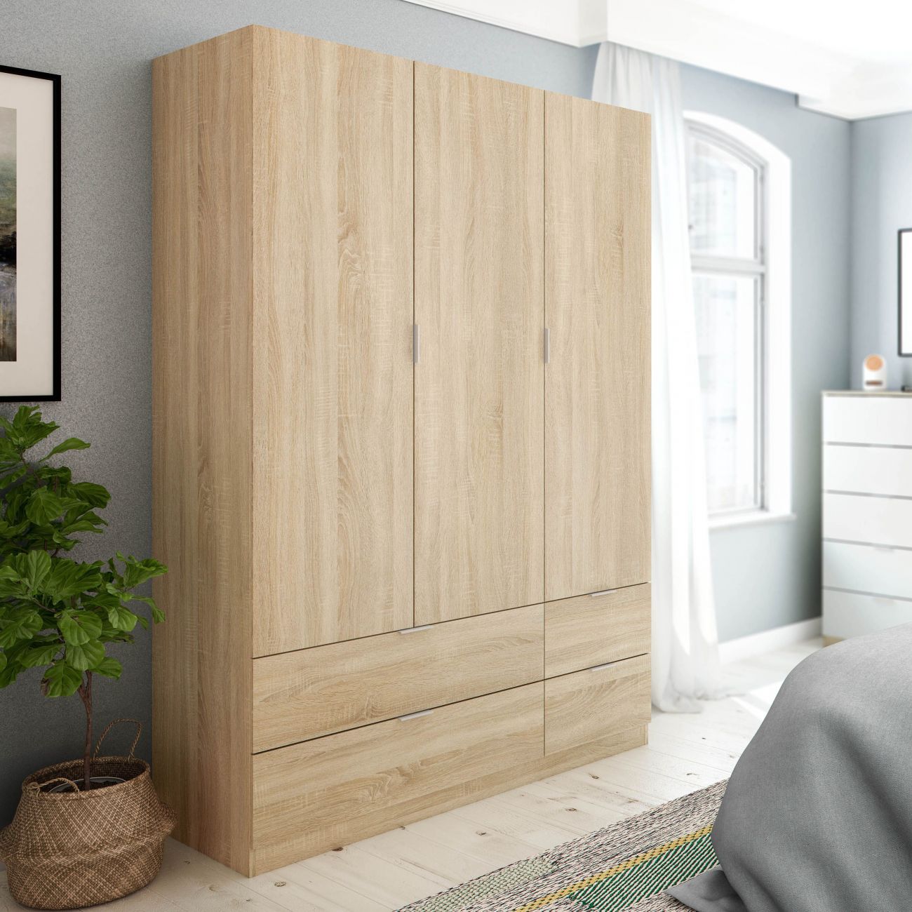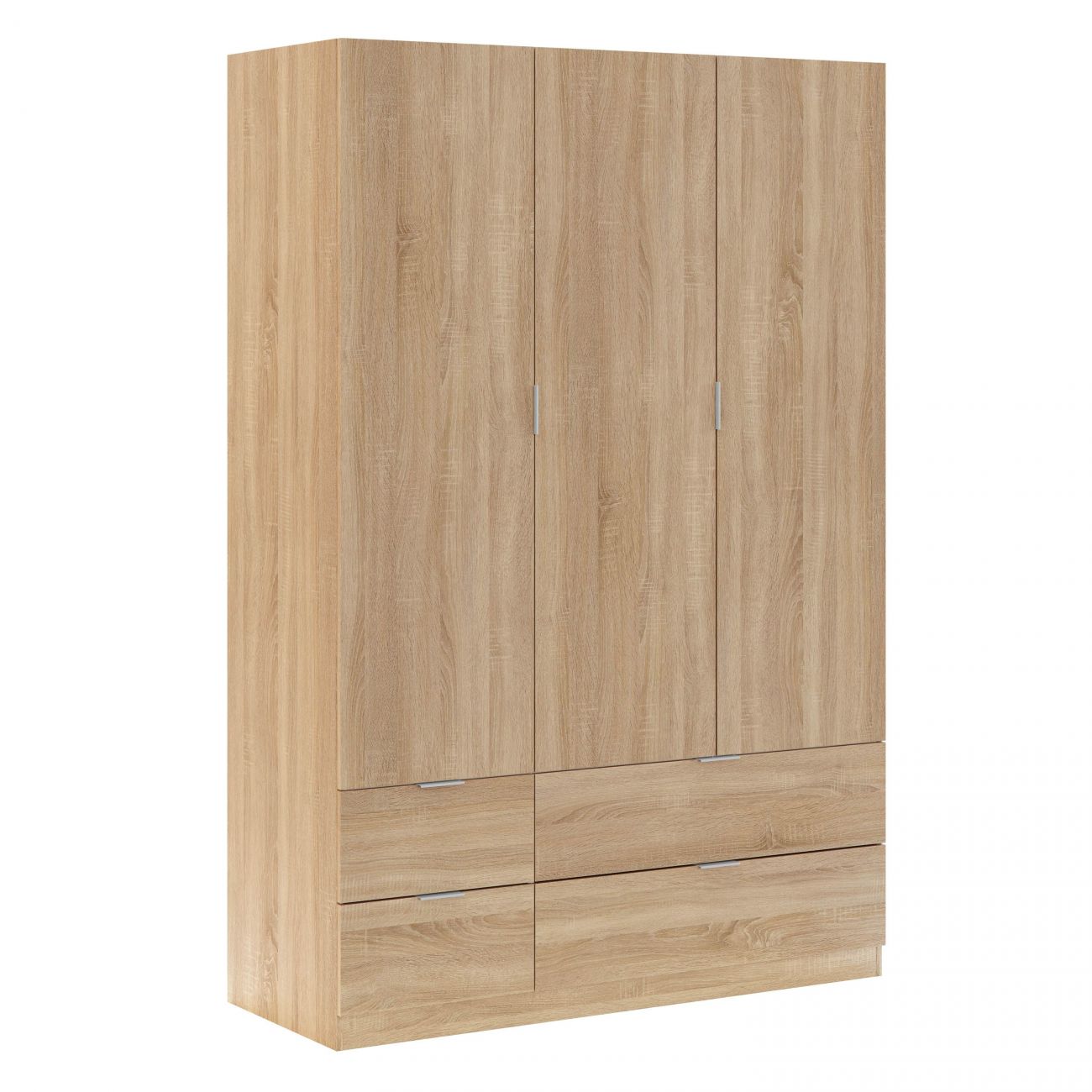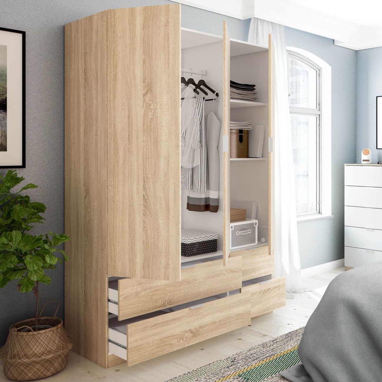 O roupeiro Dumbo de 3 portas e 4 gavetas é um roupeiro com 3 portas com dobradiças e 4 gavetas de grande capacidade. Inclui bengaleiro, módulo lateral com prateleiras, gavetas e é perfeito como roupeiro familiar.