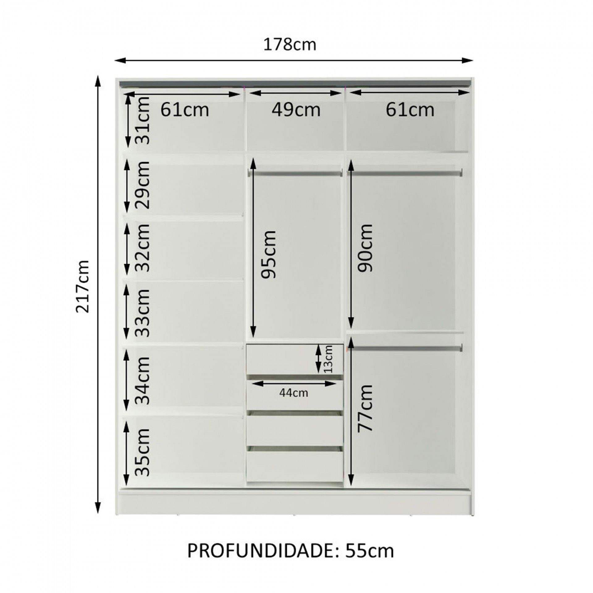 Interior do Roupeiro: Na porta do lado esquerdo possui 5 prateleiras | na porta central uma prateleira superior, um compartimento com varão a meio e 4 gavetas inferiores | na porta da direita existe 1 prateleira superior e dois compartimentos com varão, um por cima do outro. - Medidas: 180 x 217.5 x 54.7 cm