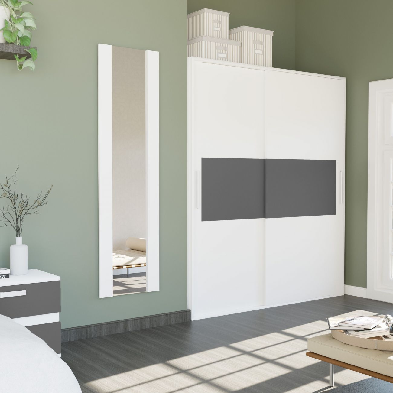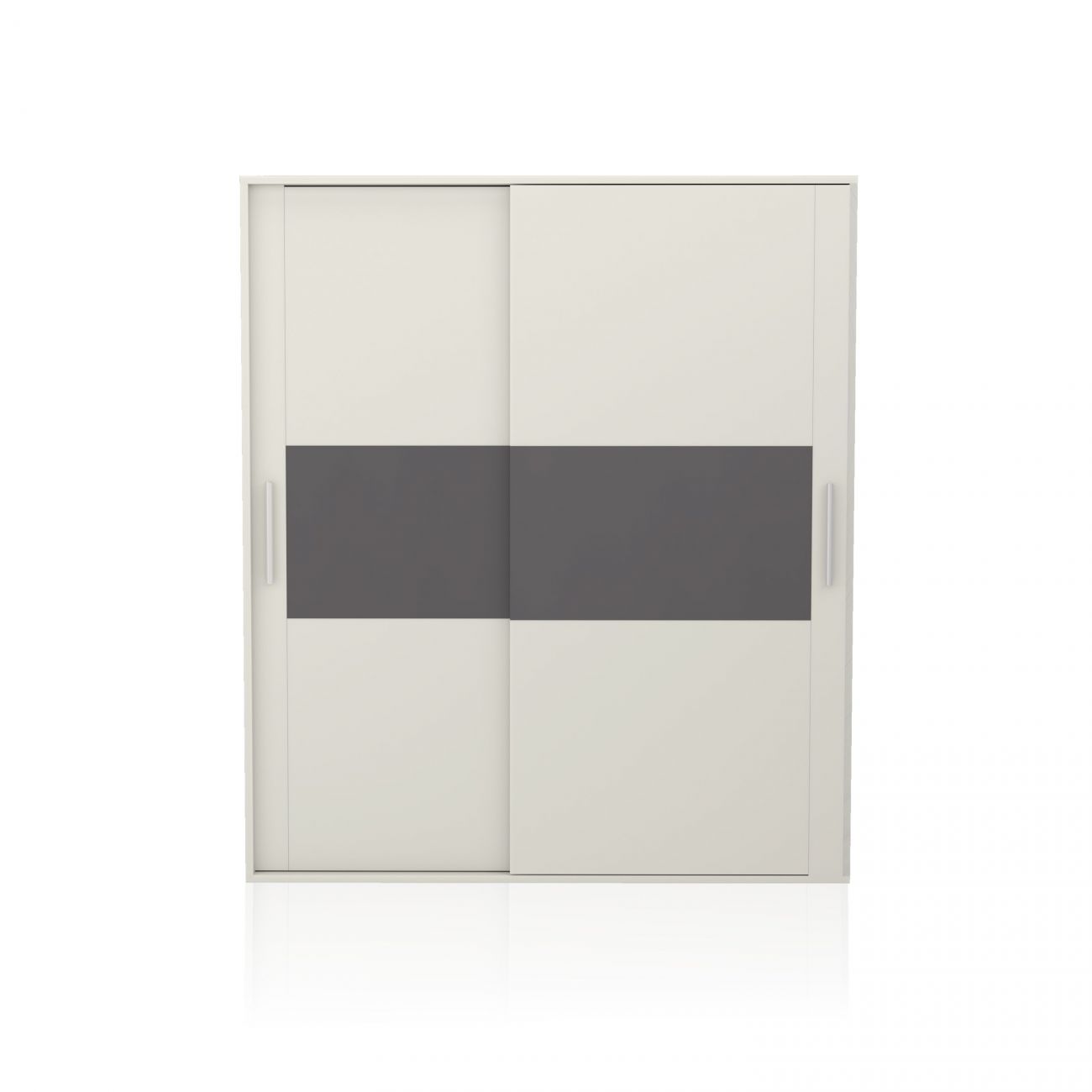 - O roupeiro é fechado com 2 portas de correr com faixas horizontais e puxadores verticais em cor contrastante, um pormenor que confere à peça de mobiliário um toque de dinamismo visual.