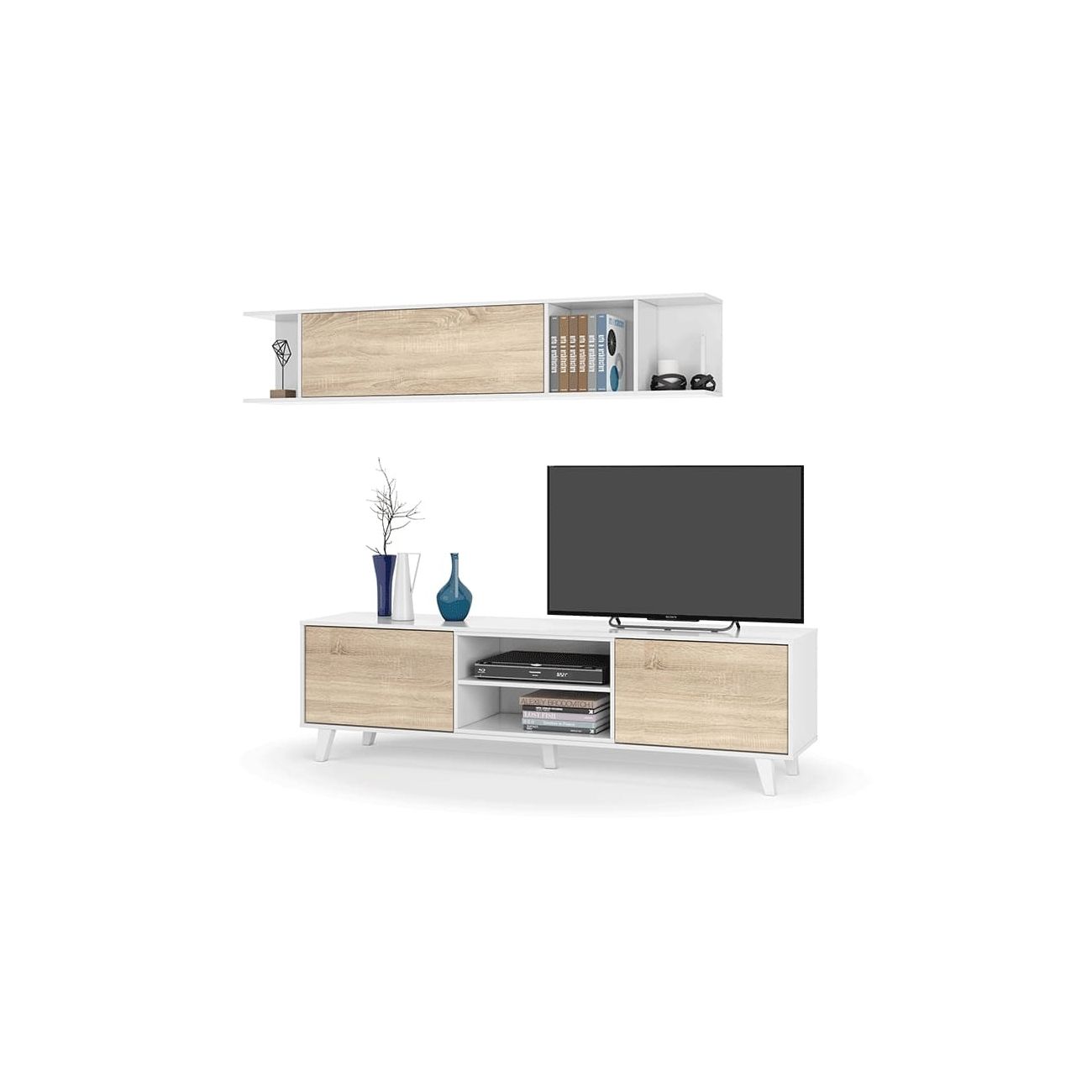 - O módulo inferior tem 2 espaços de arrumação laterais fechados com portas e um espaço central com uma prateleira, ideal para aparelhos electrónicos como DVD, leitor de CD, consola de vídeo, etc. As pernas do módulo inferior são estreitas, de estilo escandinavo. O móvel superior é composto por uma prateleira com um grande espaçode arrumaçãocentral fechado por uma porta e 3 aberturas visíveis para objectos decorativos e livros.