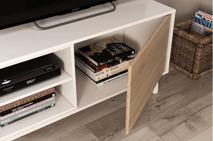 - É um móvel para televisão simples que pode decorar com muito bom gosto sem sobrecarregar. É fabricado em melamina de alta qualidade em branco brilhante e carvalho canadiano, uma combinação muito luminosa que combina com quase tudo.