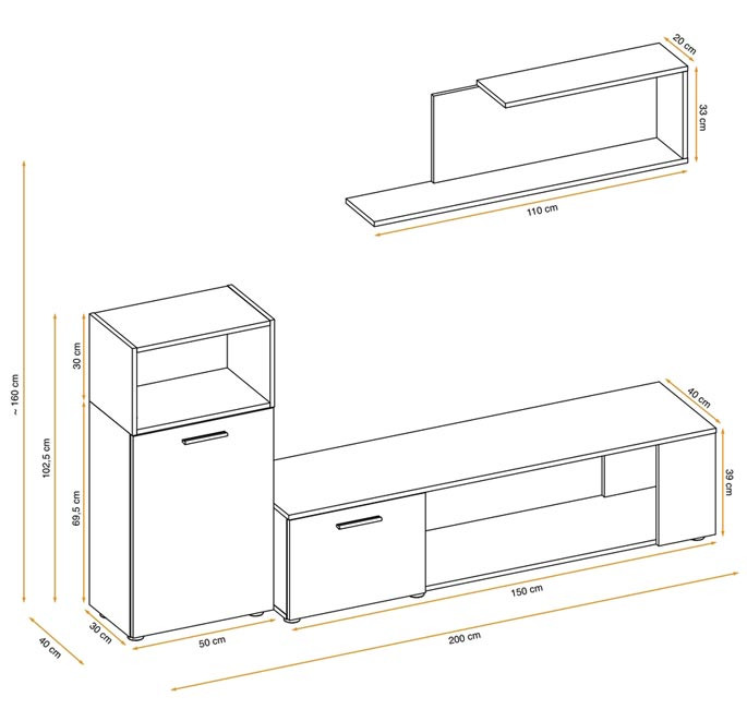 - Móvel de TV com porta e puxador: 150x40x39 cm.