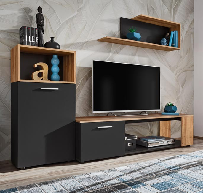 Mobiliário de sala de estar moderno composto por um móvel de TV de design original, um armário alto e uma prateleira semi-aberta a condizer.