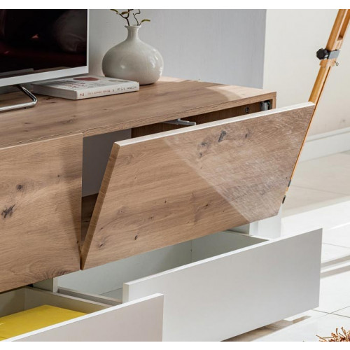 A combinação da cor natural com o branco dará luminosidade e originalidade à sua sala. A lareira enquadrada no aparador vai chamar a atenção e dar um toque acolhedor que convida ao relaxamento.