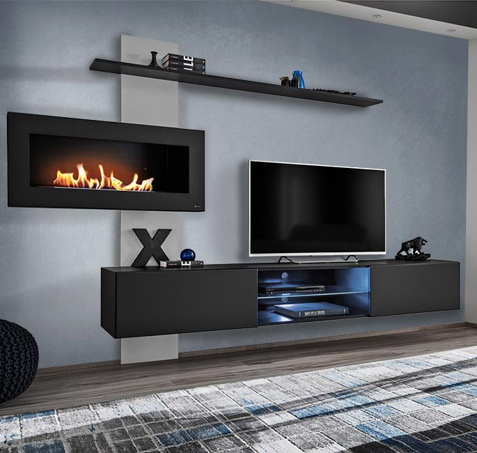 Um conjunto que inclui um armário de TV suspenso visualmente dividido em três partes com uma prateleira superior. Mas o elemento estrela é, sem dúvida, a bio-lareira suspensa, uma ideia útil para dar uma sensação de calor à sua sala ou torná-la mais acolhedora.