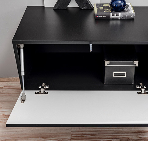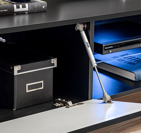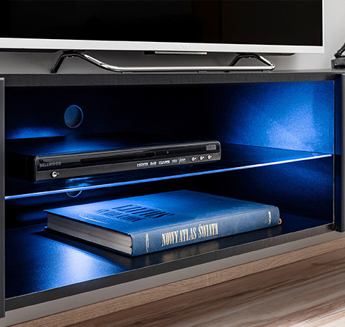 - Móvel de TV com portas laterais rebatíveis e compartimento central com prateleira de vidro com luz LED azul.