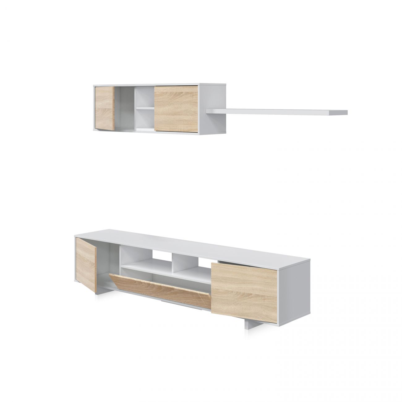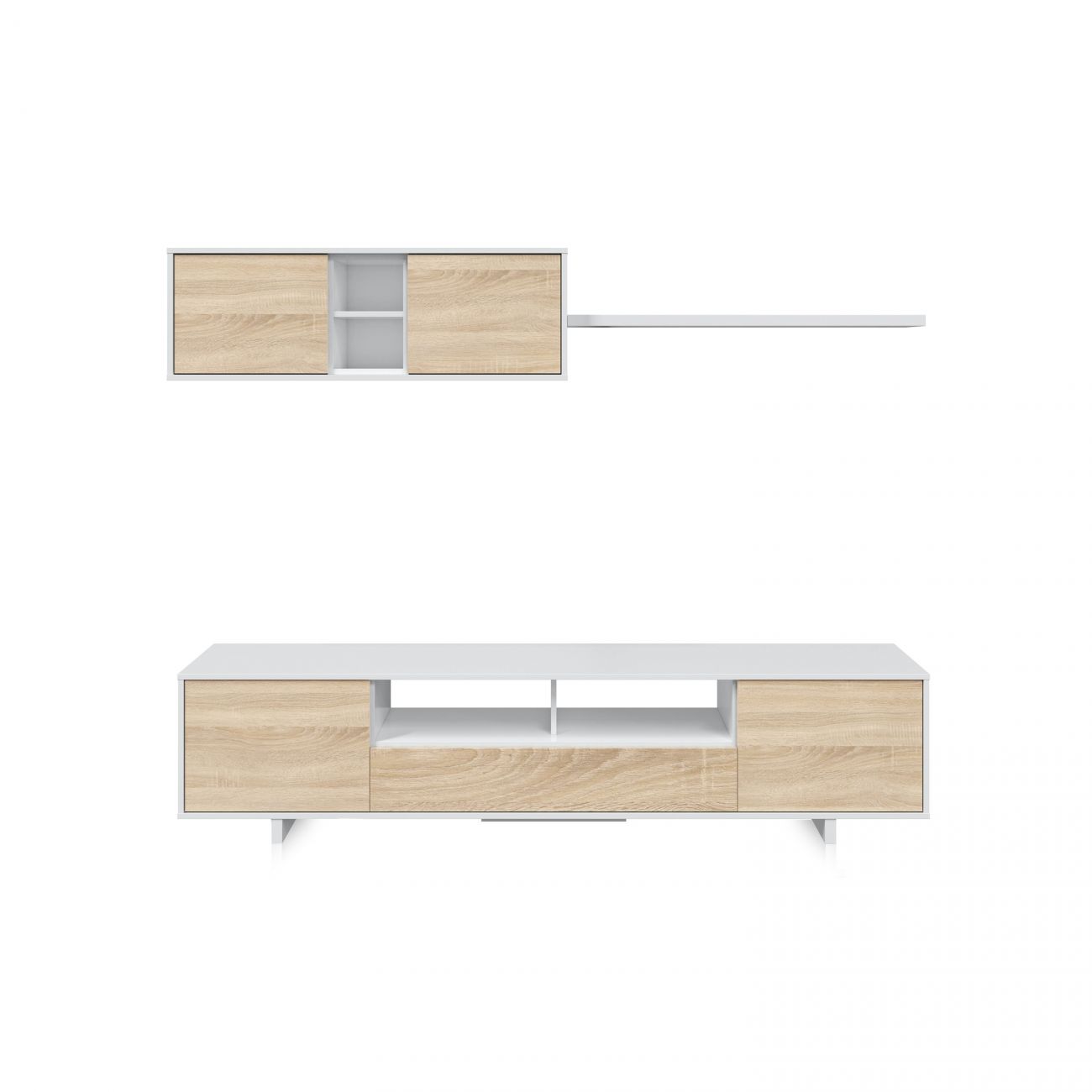 - O módulo inferior tem dois espaços de arrumação laterais fechados com portas e uma prateleira dupla no centro, ideal para aparelhos electrónicos como um leitor de DVD, consola, etc. Por baixo das prateleiras, existe também um pequeno nicho com uma porta com dobradiças.