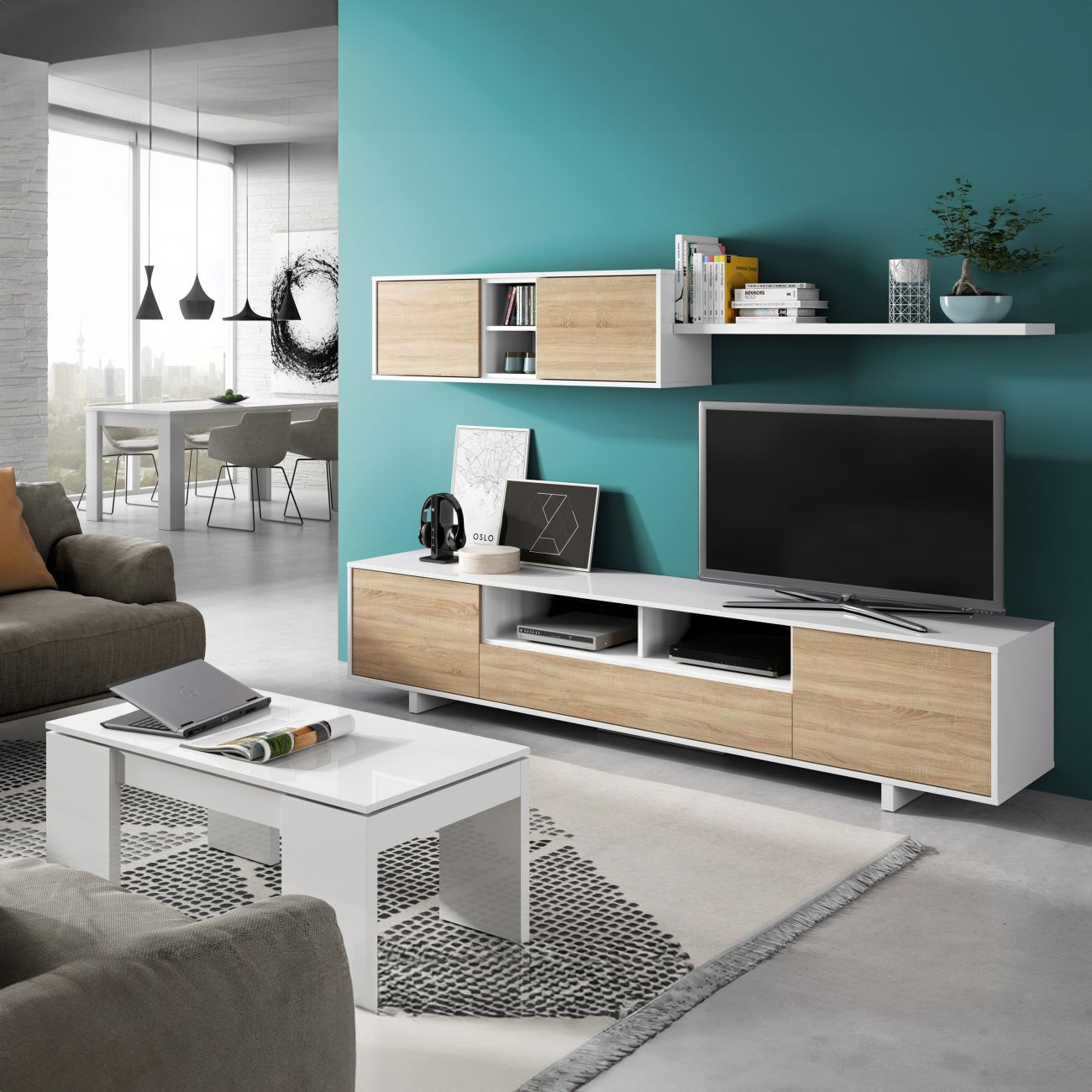 O móvel de sala de jantar Gabi é um móvel TV completo com 3 módulos, grande superfície útil e vários espaços de arrumação. Ideal para decorar a sala de estar com um estilo contemporâneo.