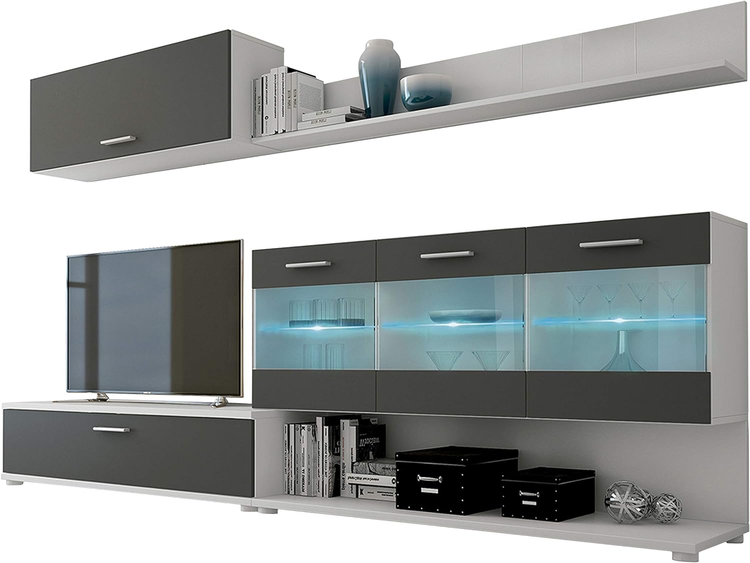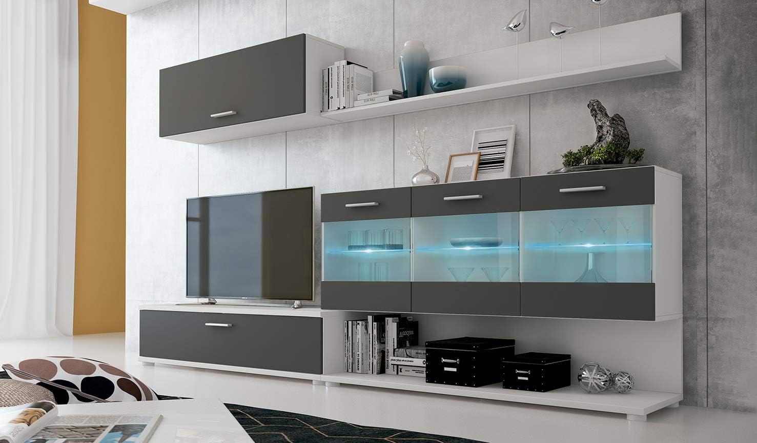 - O módulo lateral é composto por 3 armários tipo vitrina com portas de vidro e melamina que permitem ver o interior e que abrem lateralmente. No interior dos armários, luzes LED azuis iluminam os copos que aí se encontram guardados. Por baixo dos armários, existe um espaço generoso com um painel traseiro ideal para guardar revistas, jornais ou caixas de arrumação.