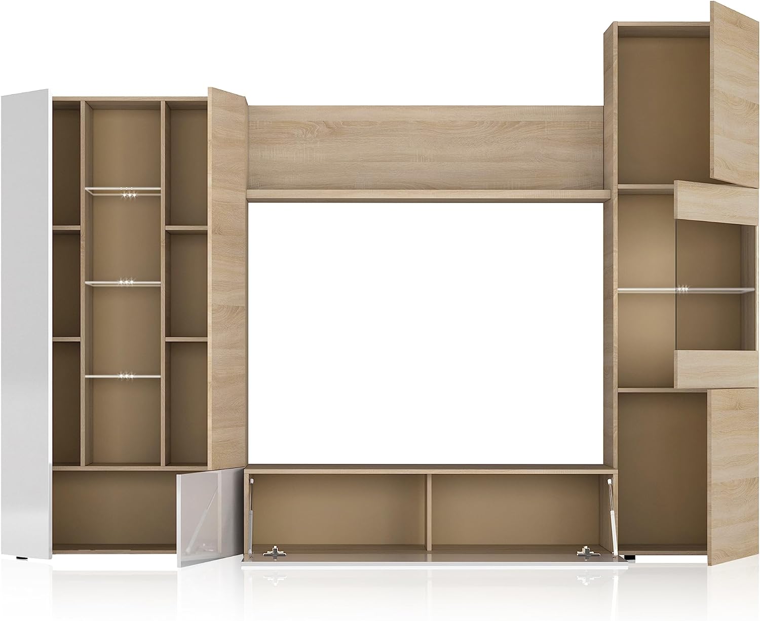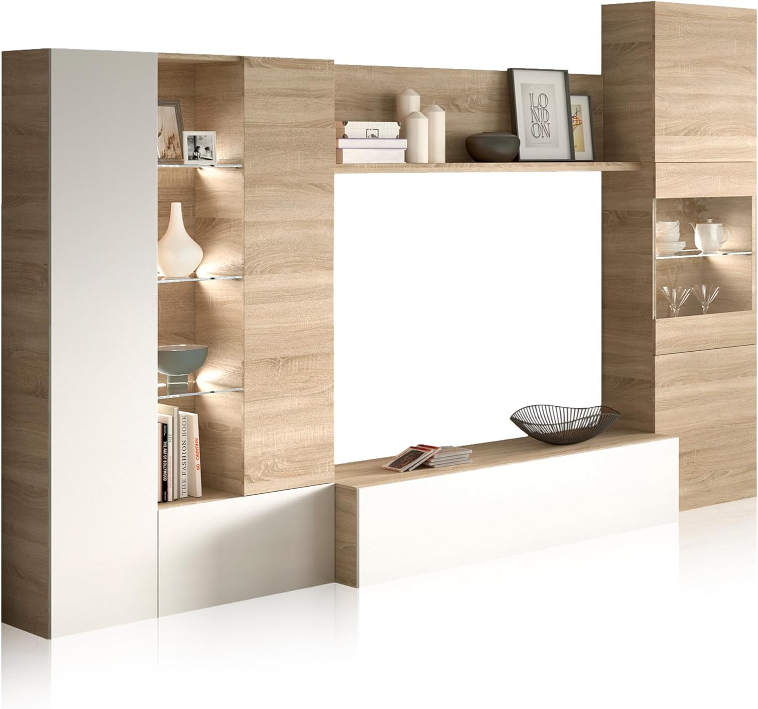- Inclui um espaço central para um televisor de 126 cm de largura e 42 cm de profundidade, e prateleiras com sistema de iluminação LED. É composto por vários módulos inferiores e laterais que combinam espaços de arrumação fechados com portas com prateleiras expostas iluminadas, pelo que, para além de permitir guardar objectos, o móvel de sala de jantar Essential contribui muito para completar a decoração da sala de estar. O móvel é rematado com uma prateleira superior que une os dois módulos laterais, fechando o móvel numa forma quadrada.