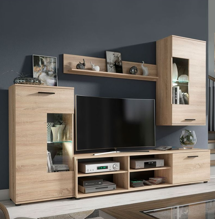 - Este móvel de sala de jantar inclui 4 módulos de arrumação/decoração: um módulo baixo para a televisão, 2 vitrinas/armários e uma prateleira de parede. Todos os elementos estão incluídos no preço. Em suma, um móvel super-equipado para arrumar todos os livros, DVDs, revistas, louça e aparelhos electrónicos de que necessita.