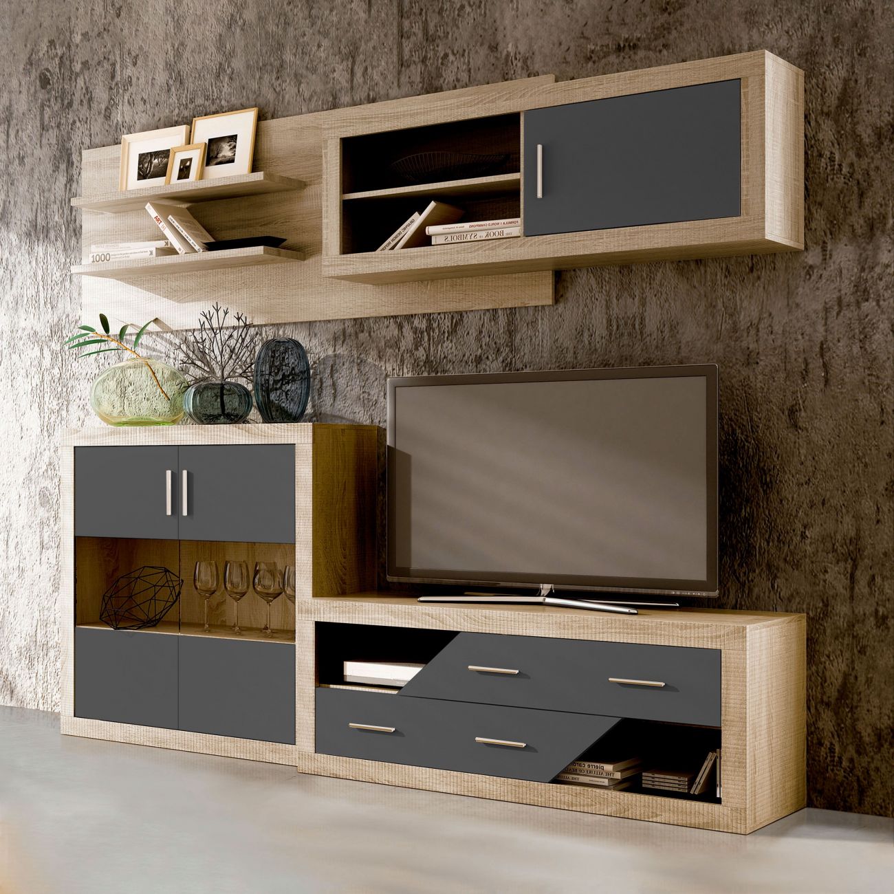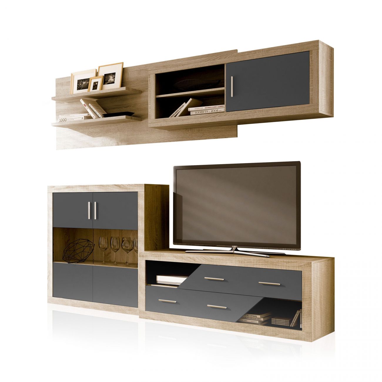 • É uma composição de móveis que pode centrar no espaço que desejar. Na parte superior estará o móvel mural com o encosto. Este será completamente independente da parte inferior e poderá adaptá-lo ao espaço de que dispõe.