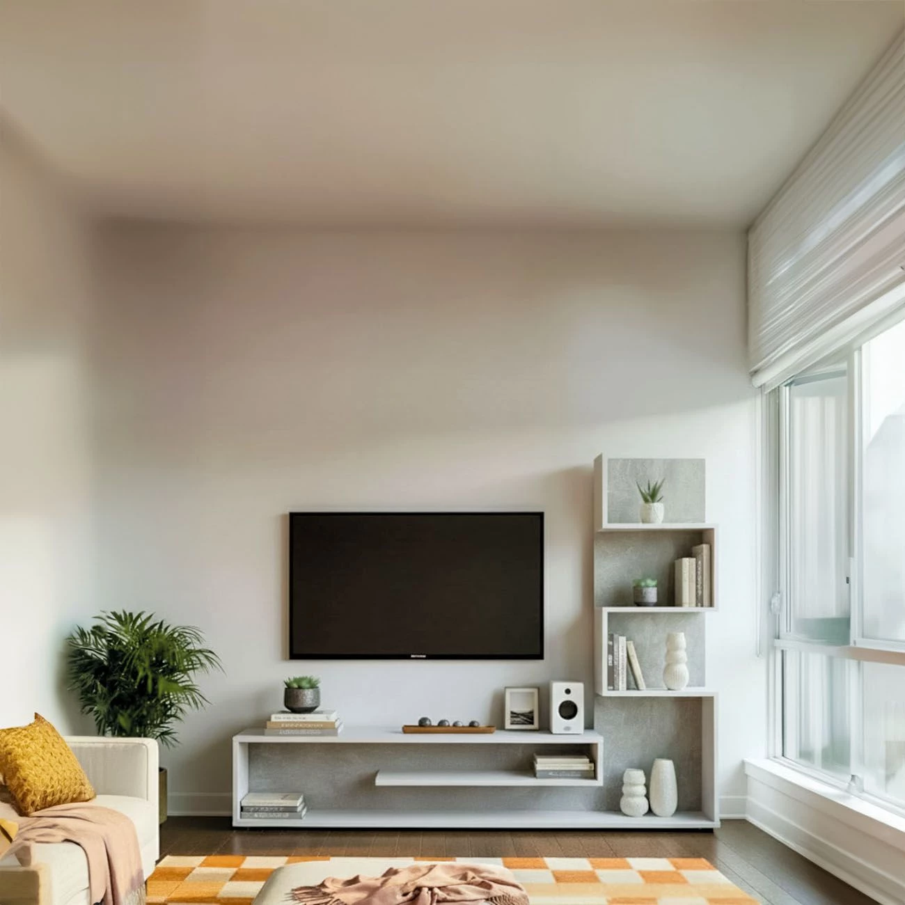 - A parte inferior oferece espaço suficiente para televisores de grande formato, consolas ou equipamentos multimédia, enquanto as prateleiras superiores permitem manter tudo em ordem sem sacrificar o design. A sua estrutura robusta e equilibrada garante estabilidade, bem como uma estética leve e moderna que confere profundidade à divisão.