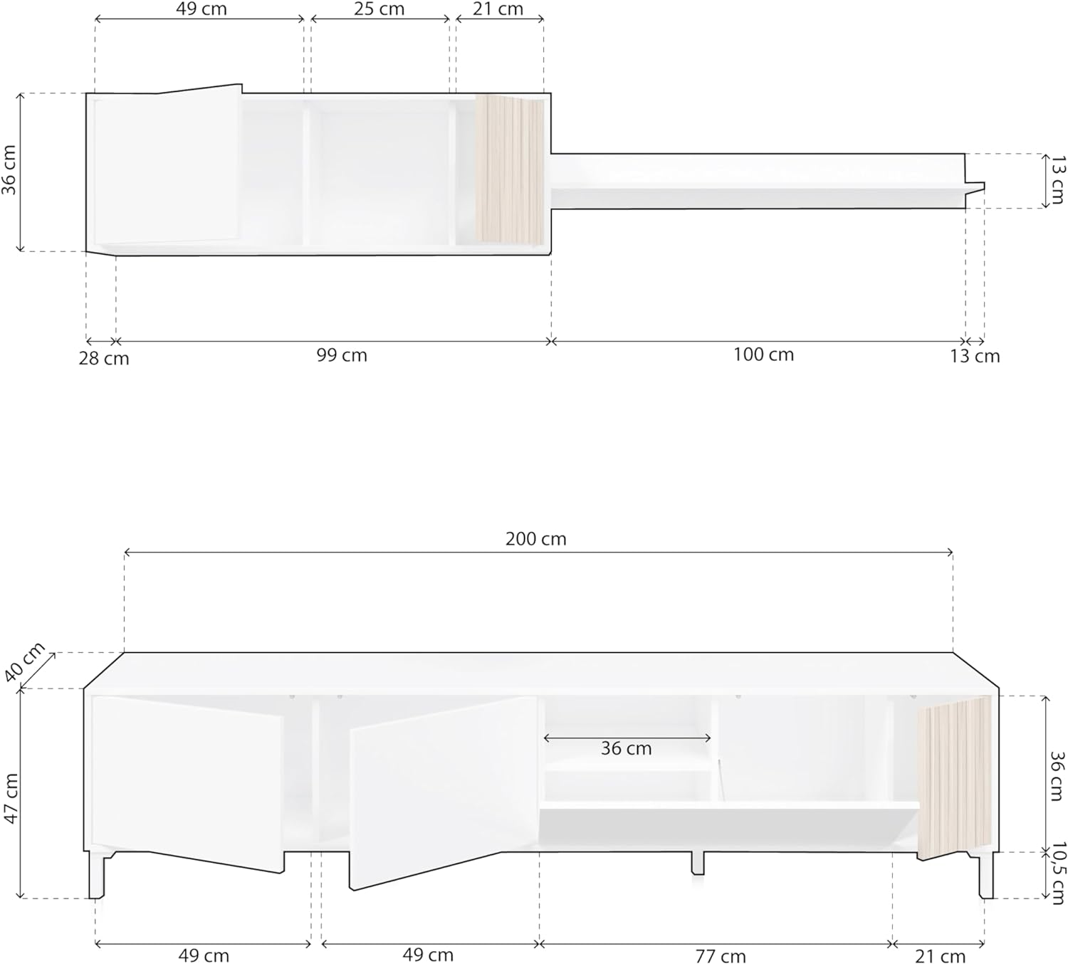 - Dimensões do móvel de TV: 200 cm (comprimento) x 40 cm (profundidade) x 47 cm (altura)