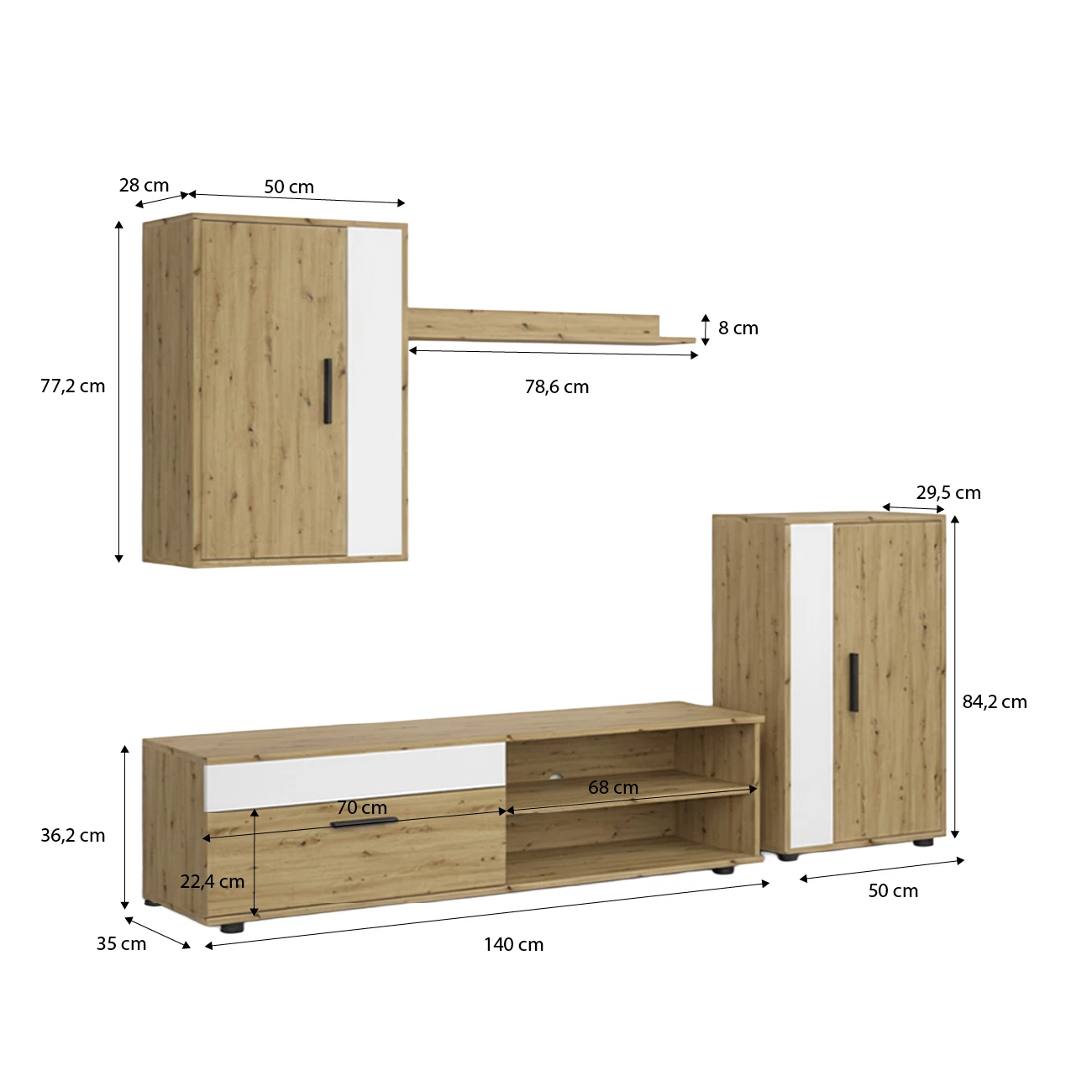- Medidas do móvel base para televisão: 140 cm (comprimento) x 35 cm (profundidade) x 36,2 cm (altura)