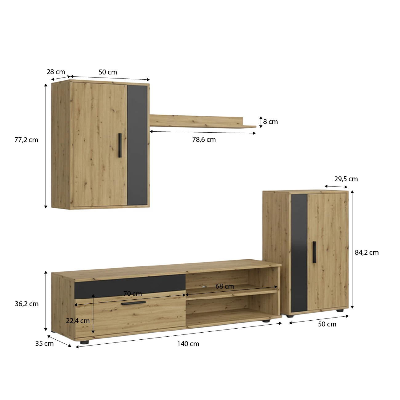 - Dimensões da prateleira superior: 78,6 cm (comprimento) x 8 cm (altura)