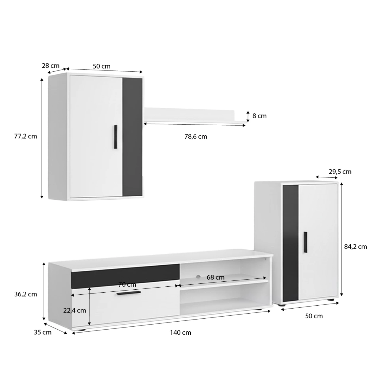 - Dimensões da prateleira superior: 78,6 cm (comprimento) x 8 cm (altura)