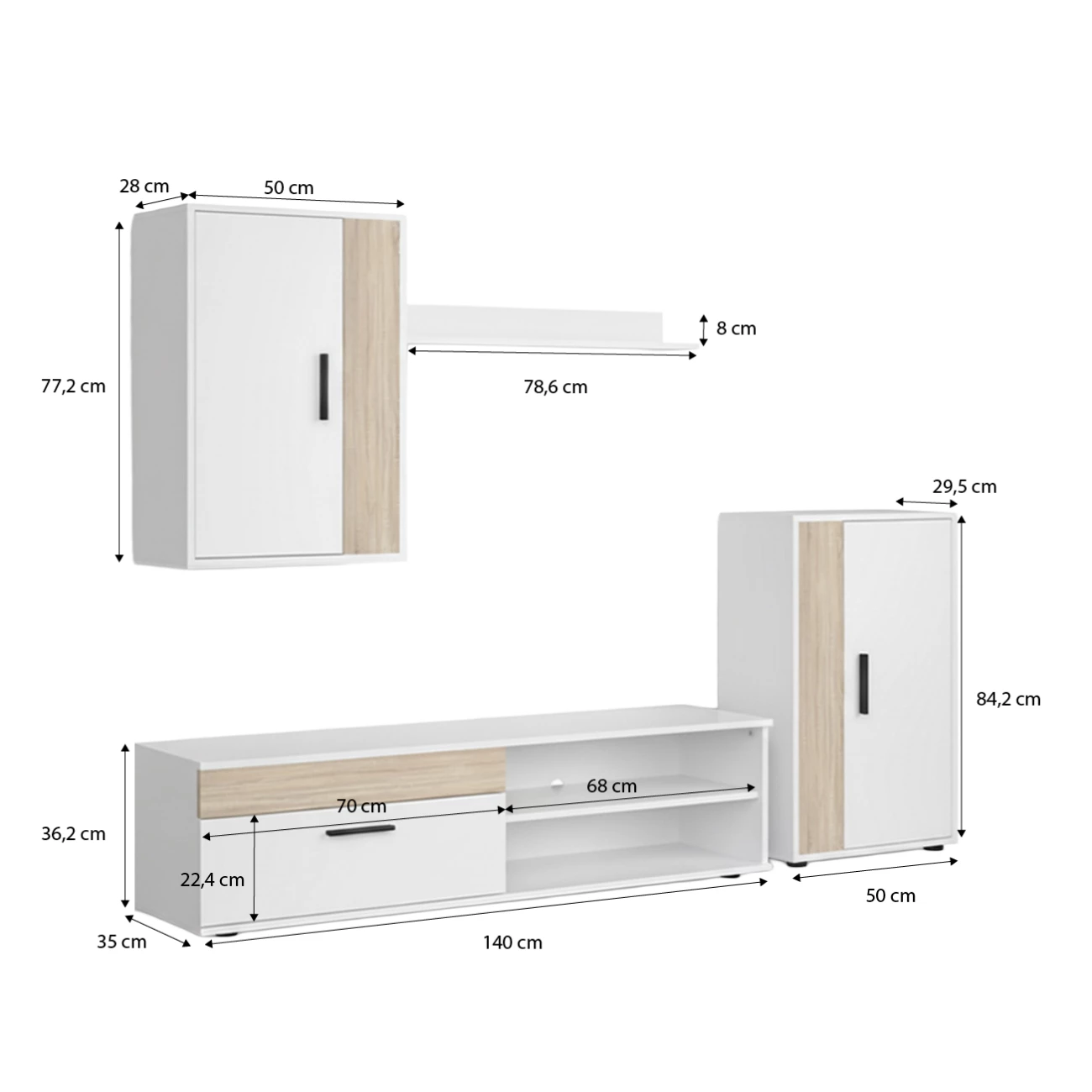 - Medidas do armário inferior: 50 cm (comprimento) x 29,5 cm (profundidade) x 84,2 cm (altura)