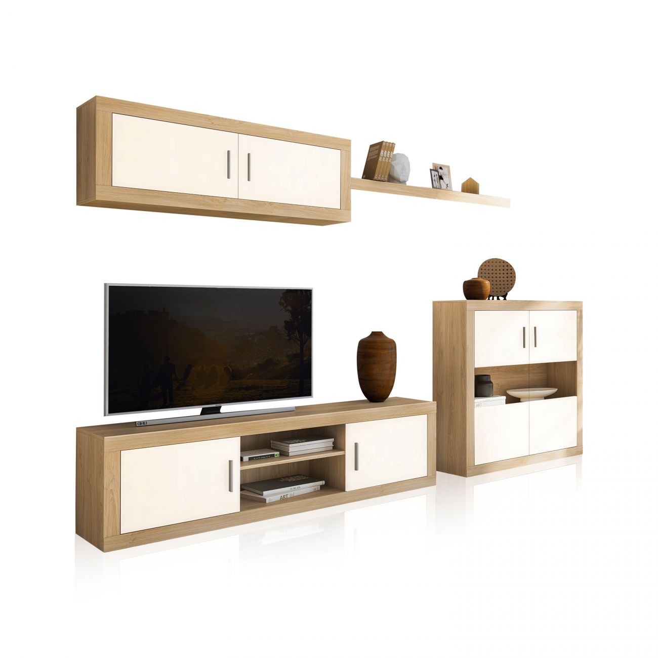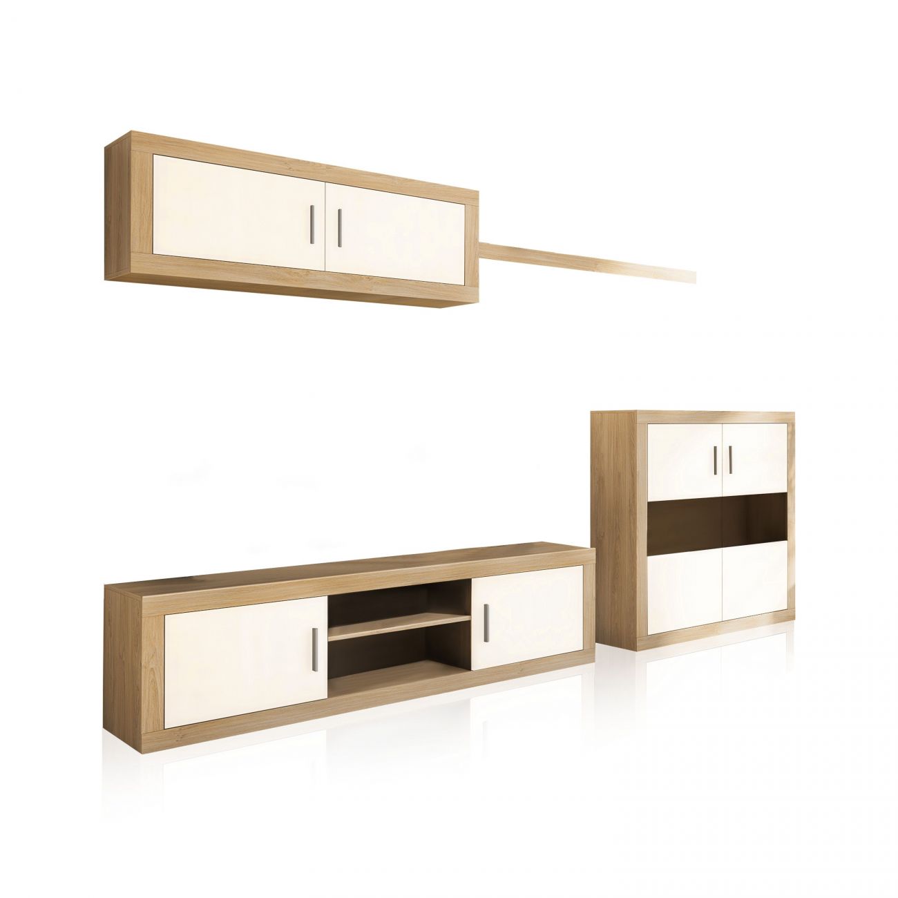 - Esta é uma das composições de mobiliário mais limpas que oferecemos como conjunto. Como espaço livre para decoração, tem apenas a prateleira, tudo o resto será organizado nos módulos com portas contrastantes. Além disso, a faixa de vidro da garrafeira permitir-lhe-á ter um espaço de decoração protegido. Perfeito para aqueles que gostam de manter tudo no seu lugar e fora da vista.