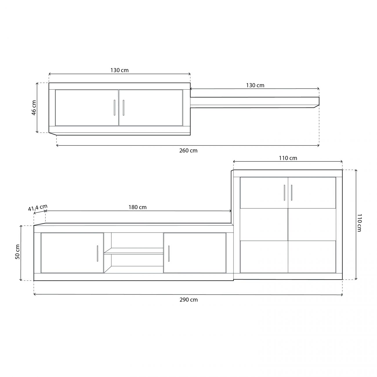 - Dimensões totais: 290 cm (comprimento da base de 2 portas + móvel de arrumação) x 41,4 cm (base maior, base de 2 portas) x 156 cm (altura do móvel de arrumação + móvel alto de 2 portas)