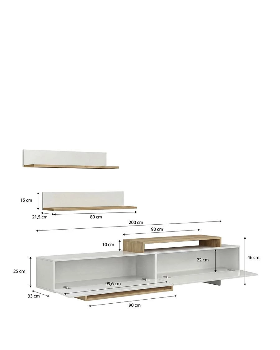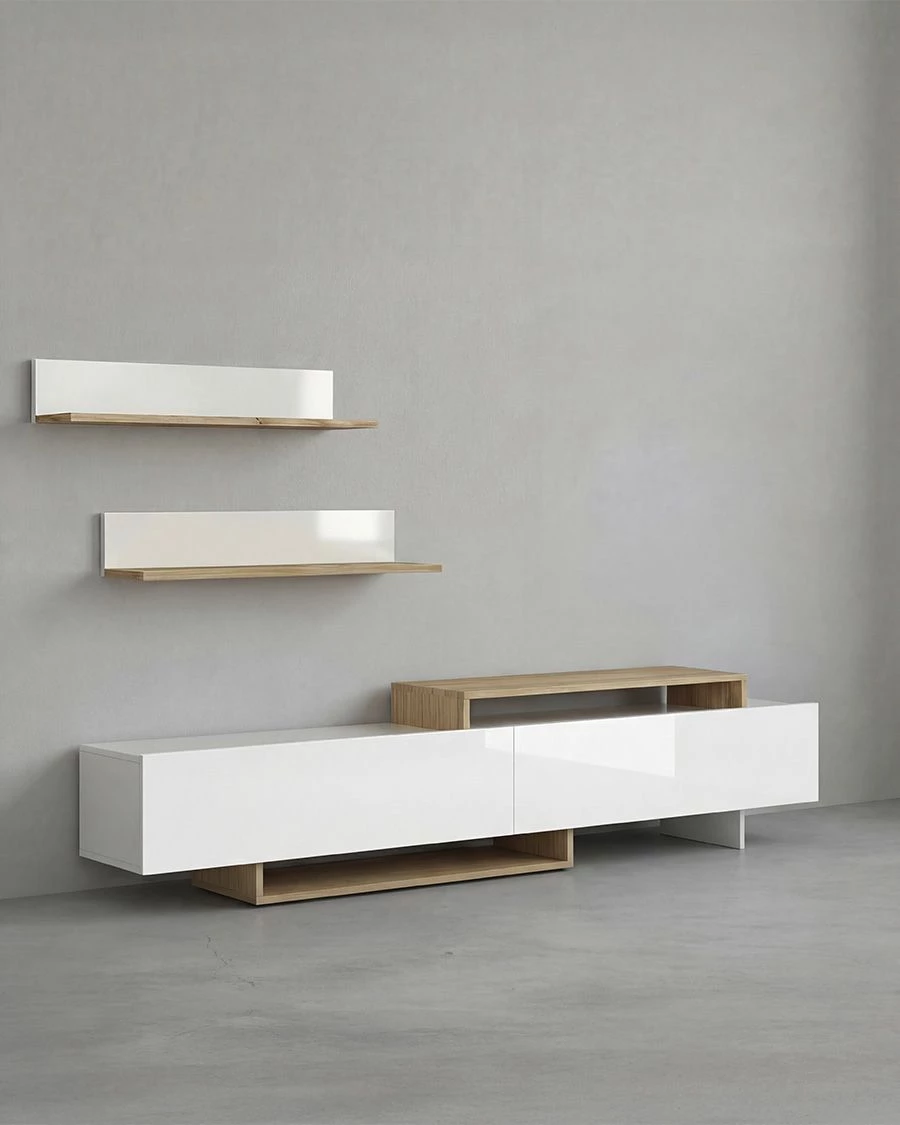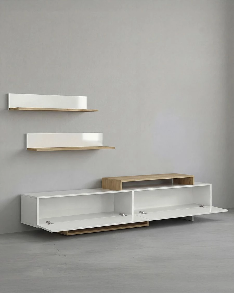 - Esta composição inclui um móvel inferior de 180 cm com uma ampla capacidade de arrumação e duas prateleiras de parede com 90 cm de comprimento, perfeitas para decorar com livros, quadros ou elementos decorativos. O móvel inferior é composto por três grandes compartimentos fechados e áreas abertas que oferecem um espaço versátil para dispositivos multimédia, consolas ou acessórios decorativos.