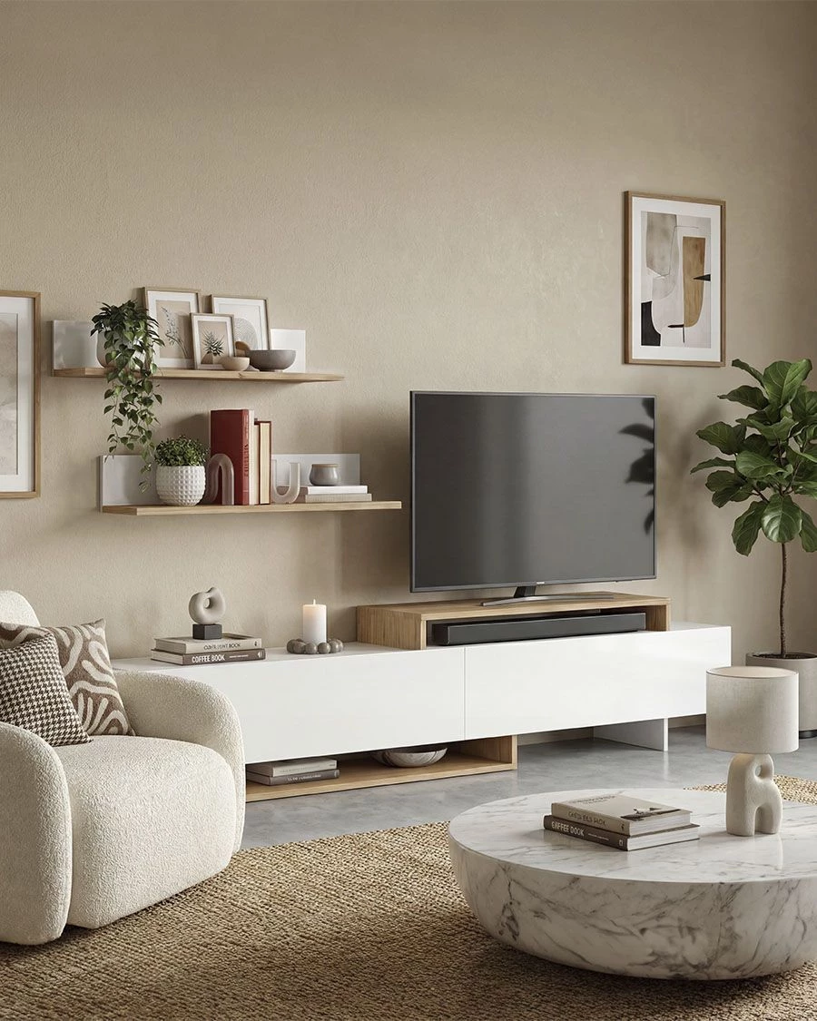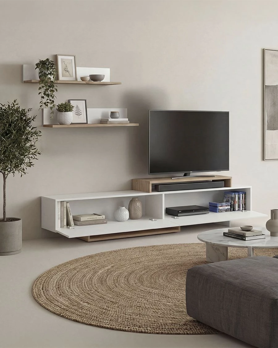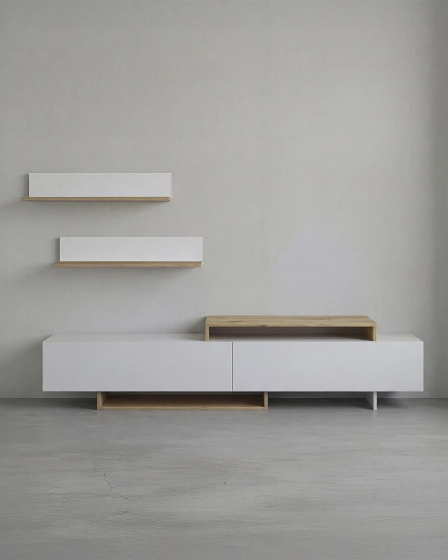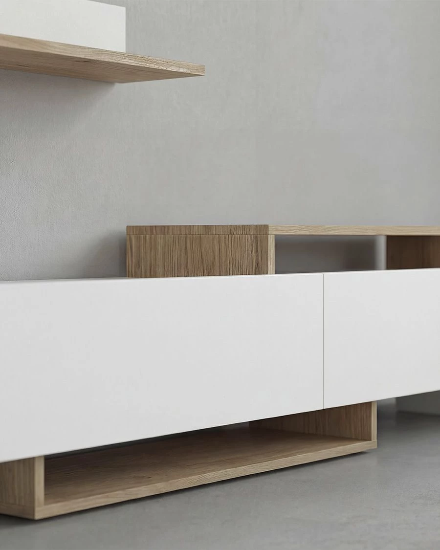 - Esta composição inclui um móvel inferior de 180 cm com uma ampla capacidade de arrumação e duas prateleiras de parede com 90 cm de comprimento, perfeitas para decorar com livros, quadros ou elementos decorativos. O móvel inferior é composto por três grandes compartimentos fechados e áreas abertas que oferecem um espaço versátil para dispositivos multimédia, consolas ou acessórios decorativos.