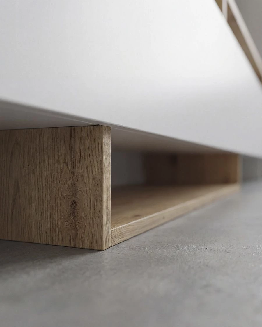 O móvel de sala de estar Well é uma composição moderna e funcional que combina elegância e calor com um acabamento alpino. O seu design contemporâneo e minimalista torna-o uma escolha ideal para salas de estar modernas que procuram um equilíbrio entre estética e praticidade.