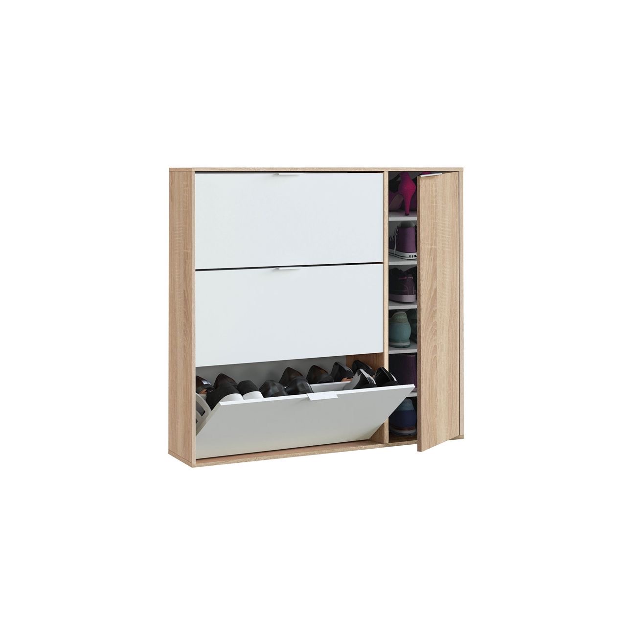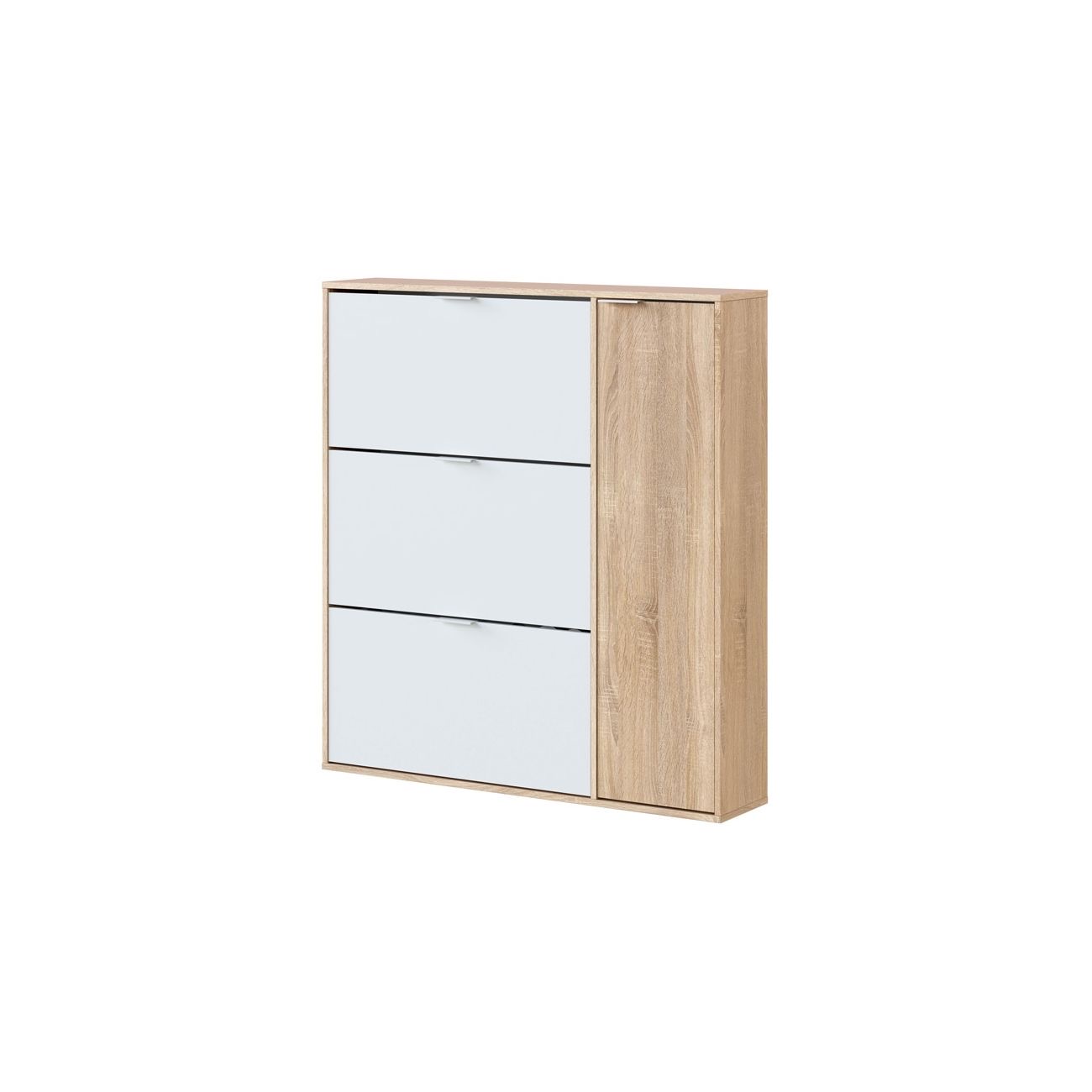 - Além disso, a sapateira inclui um módulo lateral com um armário com porta com dobradiças, dobradiças metálicas e 5 prateleiras no interior (6 furos). Estas prateleiras incluem suportes metálicos para uma melhor fixação, mas estão soltas, pelo que pode retirá-las para criar espaços maiores no interior. Os 4 puxadores da sapateira são todos em alumínio pintado de branco, e todos os interiores do armário são brancos.