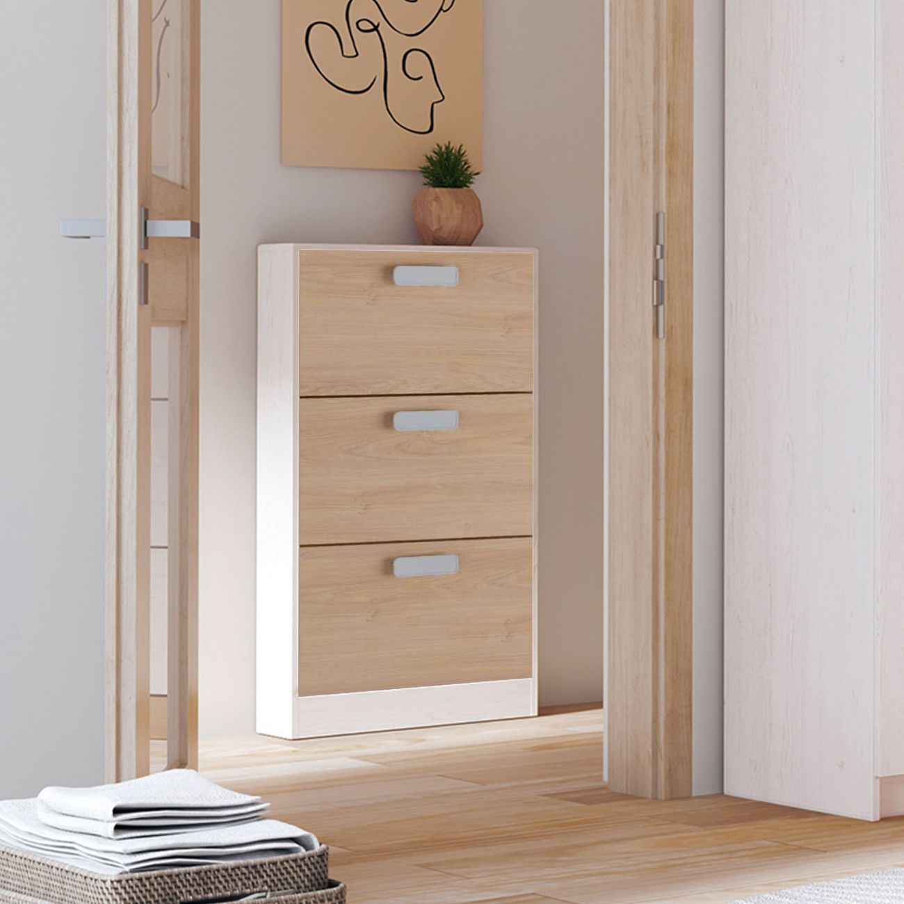 A sapateira Vanda é uma sapateira de 3 portas funcional e prática com a qual pode decorar qualquer divisão da sua casa, será muito prática nos espaços. Combina na perfeição com um estilo nórdico ou minimalista.