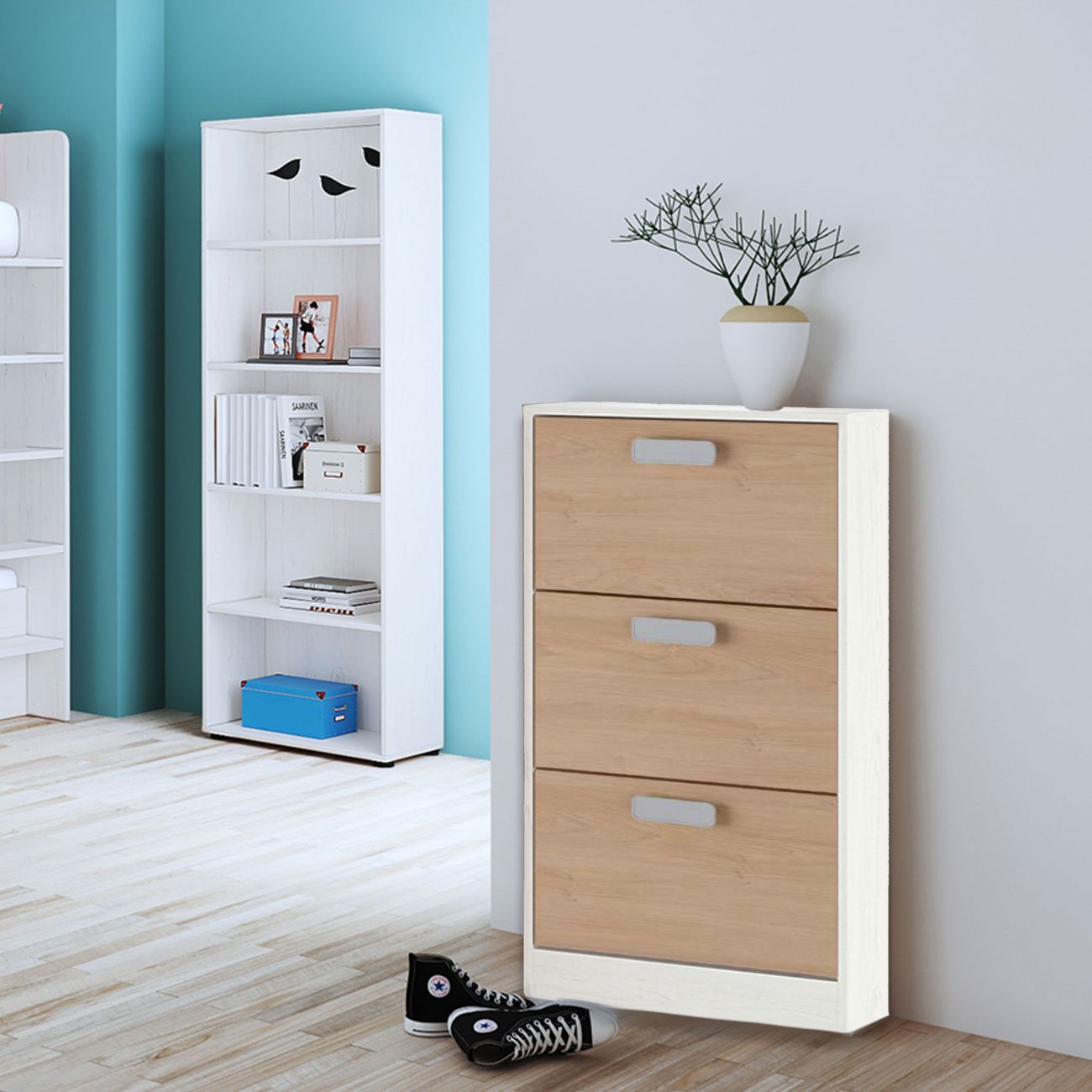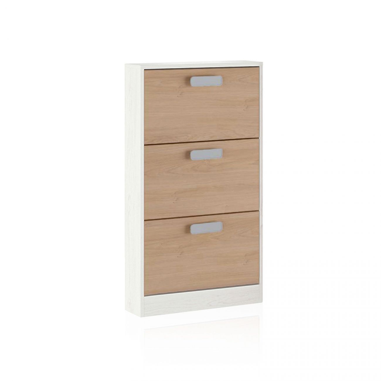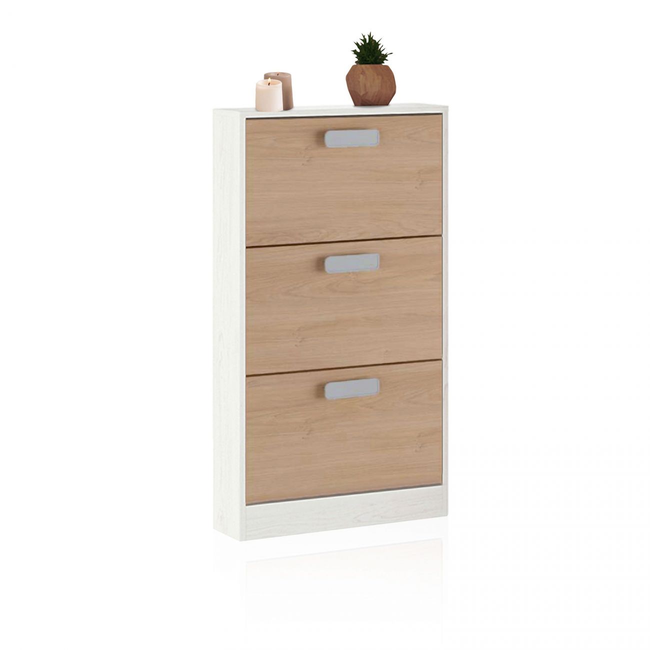 • É uma sapateira com capacidade para guardar cerca de 3 pares de sapatos em cada uma das 3 portas que a compõem, portanto, com capacidade para cerca de 9 pares de sapatos. As portas contrastantes e basculantes dar-lhe-ão, sem dúvida, o design perfeito para a sua casa moderna. Tem uma largura total de 60 cm, uma altura de 108 cm e uma profundidade de 17 cm. Destacamos a profundidade reduzida, pelo que pode ser colocada perfeitamente em corredores estreitos ou em qualquer outra divisão com espaço reduzido.Inclui um puxador elegante e fino para cada porta.