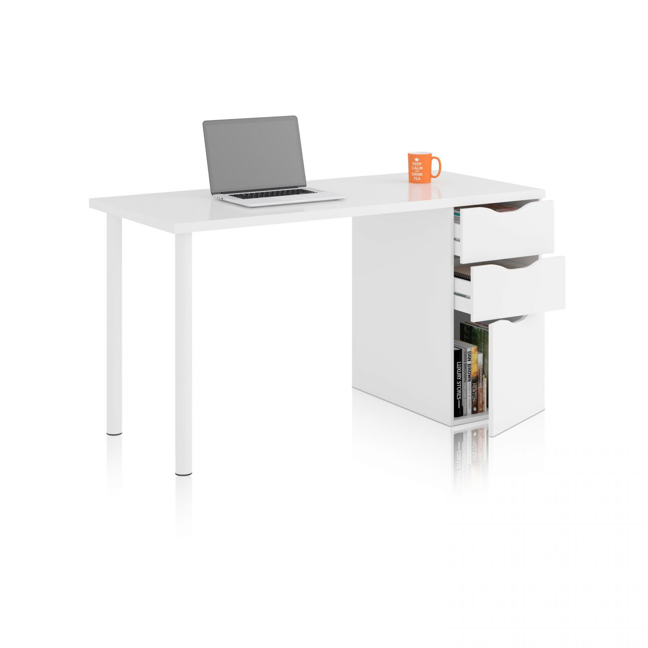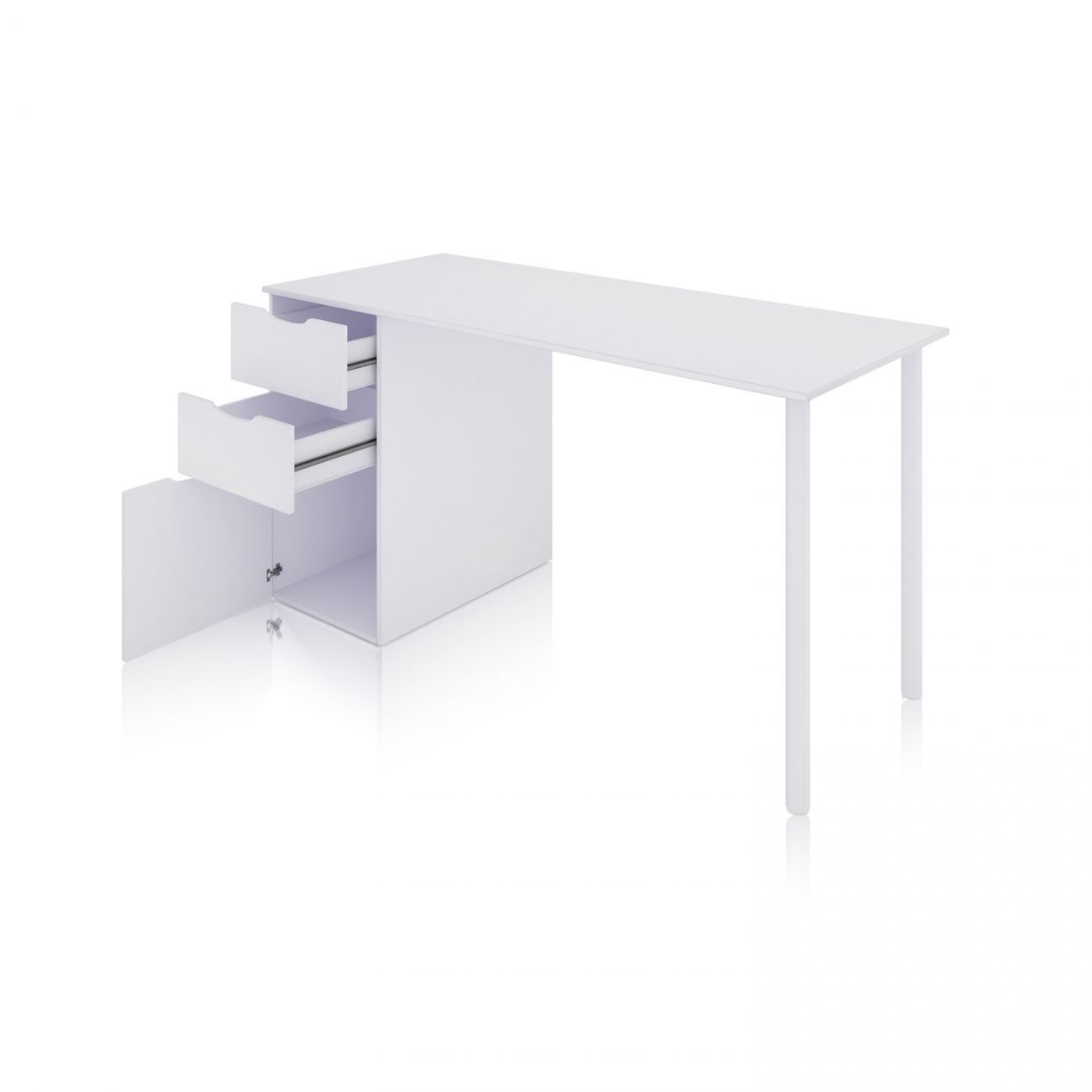 - O seu design minimalista em branco mate confere um estilo contemporâneo e simples, ideal para escritórios, quartos ou áreas de estudo em casa. Graças à sua estrutura robusta, dimensões espaçosas e três gavetas de arrumação, esta secretária combina funcionalidade e estética para lhe proporcionar a melhor experiência de utilização.