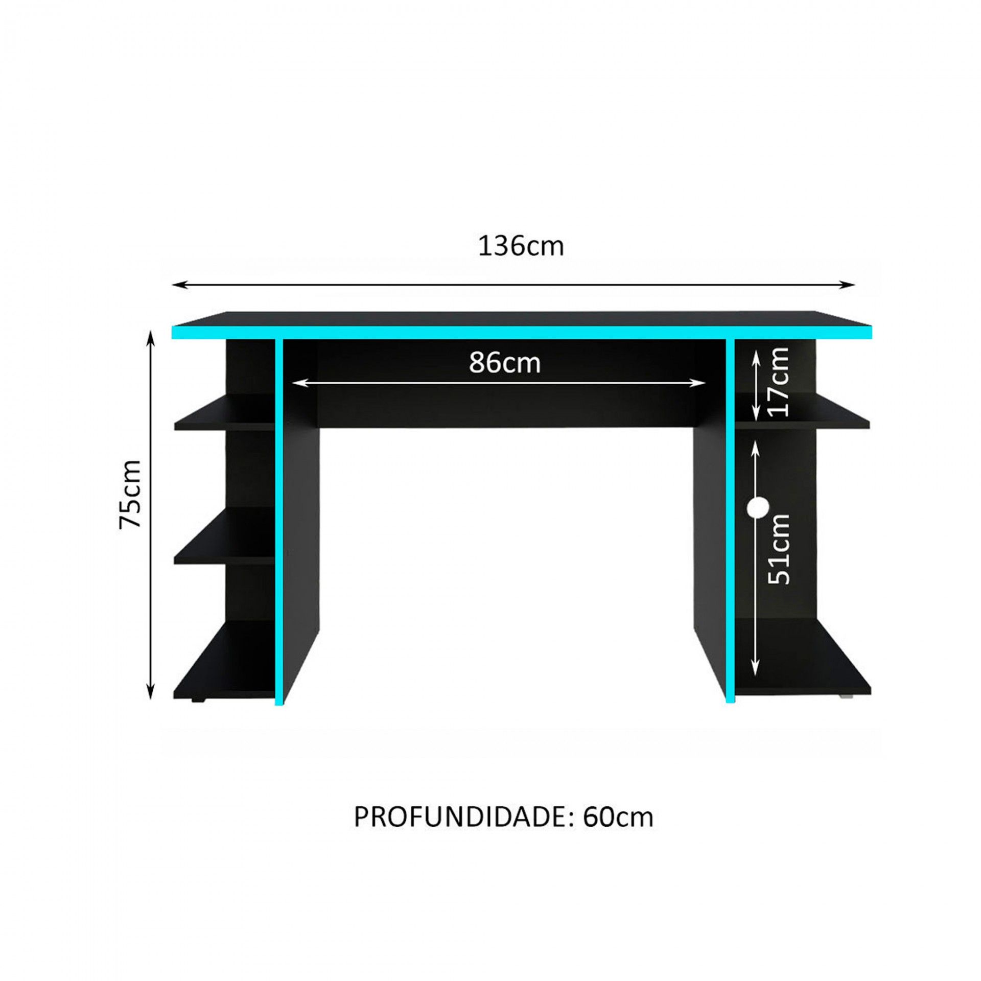 - Ampla superfície de trabalho: acomoda vários monitores, teclado, e outros acessórios de forma organizada