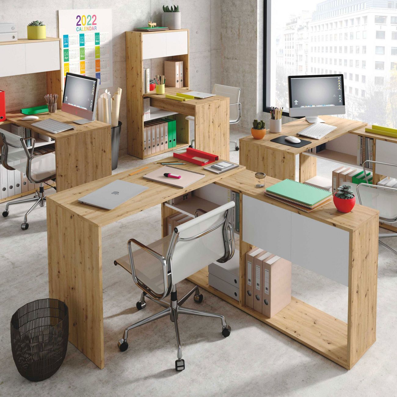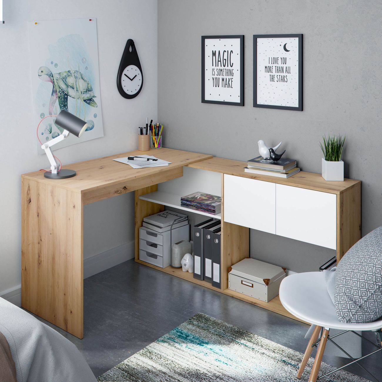 - É uma mesa de estudo muito versátil que se adapta perfeitamente às suas necessidades, pois é muito versátil, uma vez que é reversível. É ideal para escritórios em casa ou quartos onde se pretende ter um espaço para trabalhar ou estudar. É uma mesa com 3 espaços fixos de prateleiras em altura e 2 portas contrastantes.