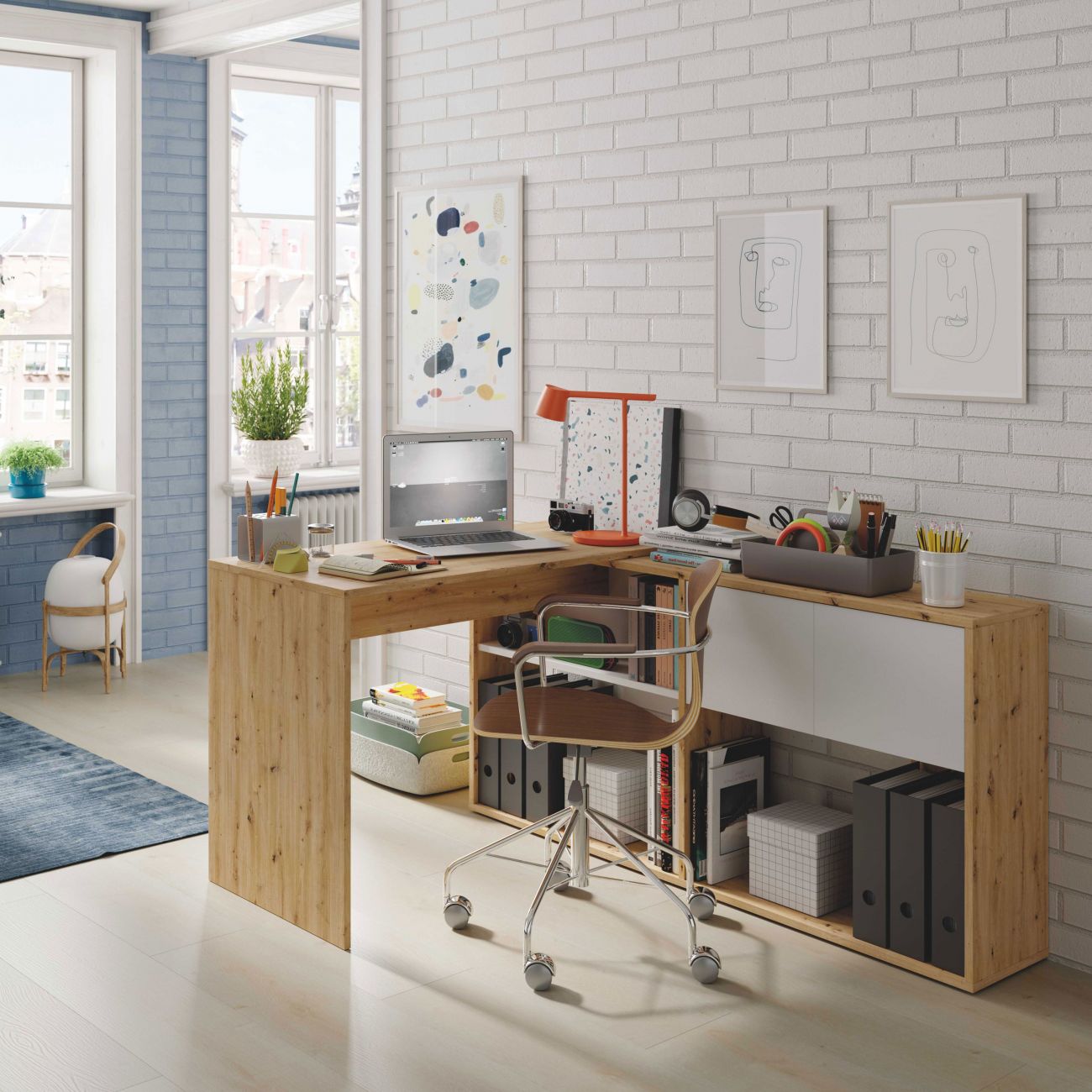 A secretária Polivalente é uma mesa de estudo com prateleiras e duas portas. Se procura uma mesa para um espaço complicado mas com muitas oportunidades, esta é a mesa para si! Reversível para se adaptar às suas necessidades.