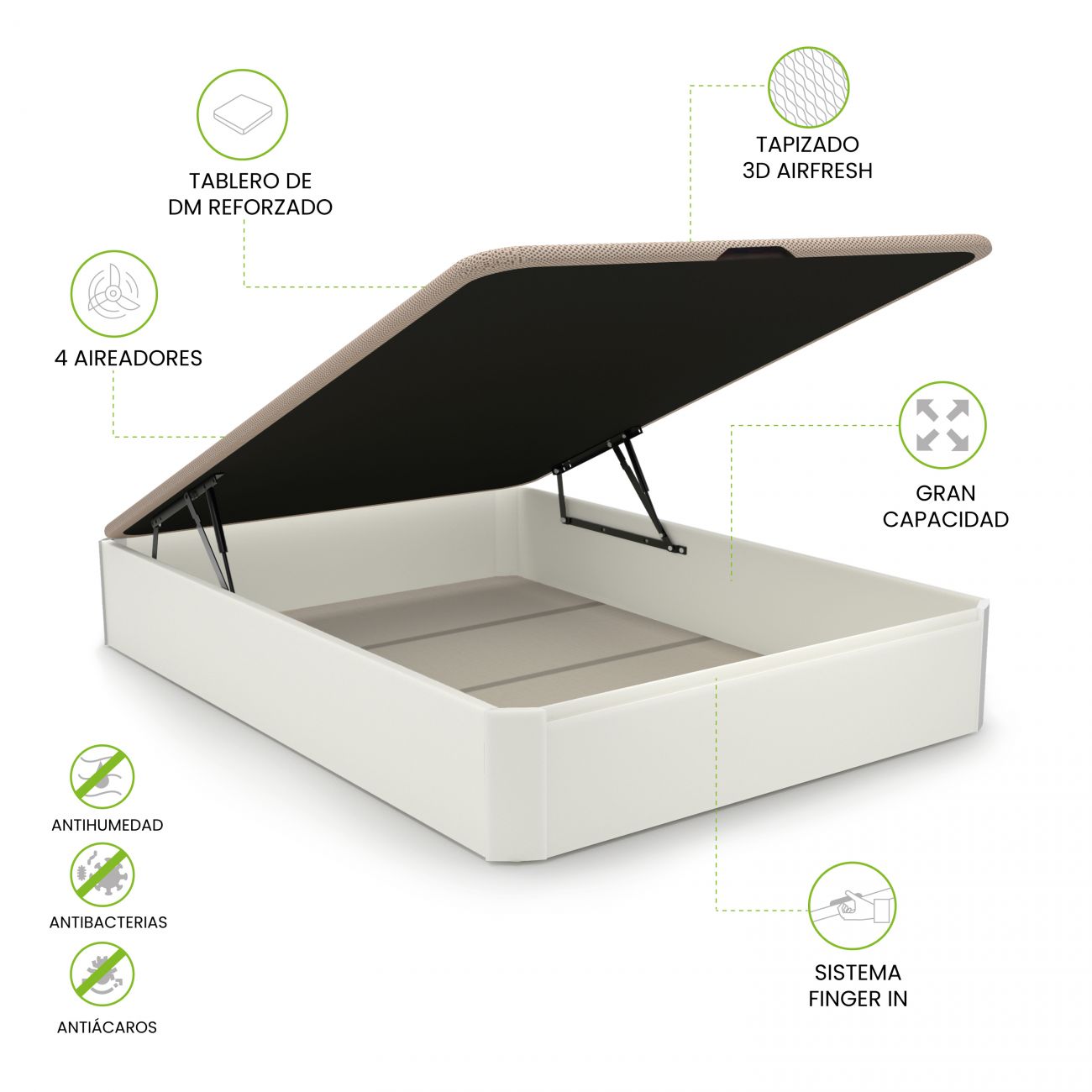 - Possui um sistema de ventilação interior composto por 4 válvulas de ventilação, um sistema que, juntamente com a sua cobertura estofada em tecido 3D, garante que tanto a roupa guardada como o colchão colocado em cima da base estão sempre bem ventilados, sem acumulação de calor ou maus cheiros.