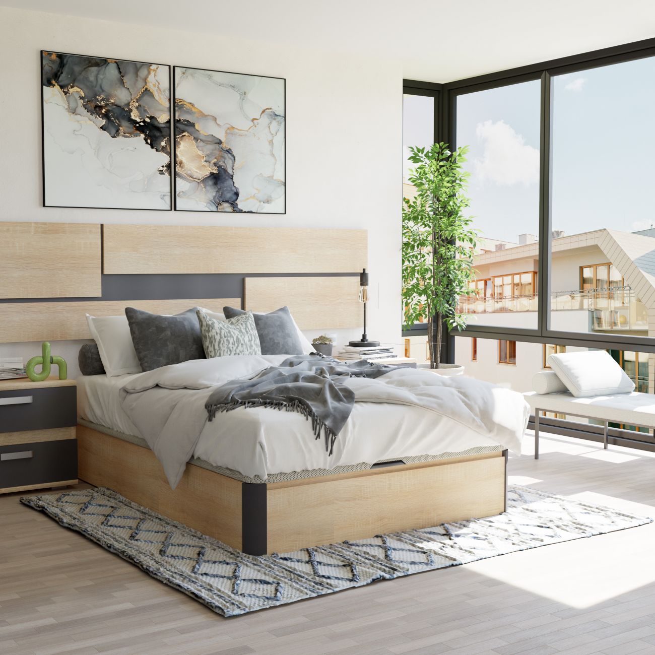 A sommier Fiesta é uma peça de mobiliário de quarto que facilitará a sua vida graças ao seu grande espaço de arrumação interior com sistema de ventilação, aos seus acabamentos de qualidade e à sua altura elevada. Uma peça de mobiliário indispensável se precisar de arrumação extra em sua casa, mas não tem mais espaço para roupeiros ou gavetas.