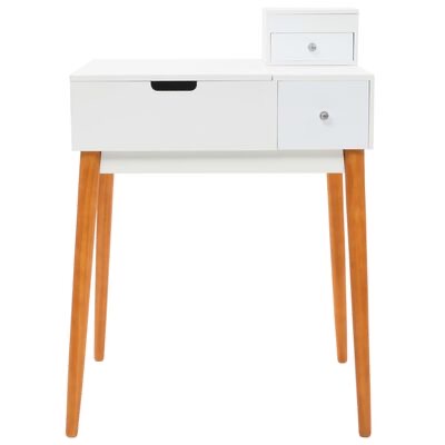 Esta mesa é feita em MDF e tem um espelho de vidro. Possui um painel esquerdo que pode ser levantado para revelar um espelho e compartimentos espaçosos para jóias. Fornece muito espaço para os seus cosméticos, produtos de cabelo e artigos de cuidados da pele. Quando o espelho não está a ser utilizado, o tampo da mesa torna-se num local perfeito para colocar uma variedade de produtos de maquilhagem, beleza e jóias. As resistentes pernas de madeira também contribuem para a sua estabilidade, bem como para o seu estilo moderno de meados do século.