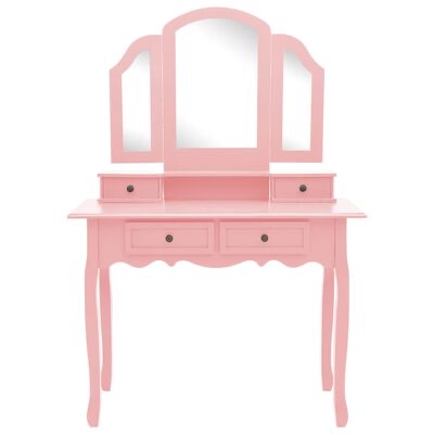 A mesa de maquilhagem tem um espelho de mesa 3-em-1, 2 espelhos laterais dobráveis com dobradiças duráveis. Pode movimentá-los para o ângulo desejado. Uma admirável surpresa é a moldura do espelho e a mesa que podem ser usadas separadamente. Quatro gavetas elegantes oferecem espaço adicional para os seus ornamentos, cosméticos e outros pertences pessoais. Esta mesa de cosmética com banco será certamente o destaque em qualquer ambiente.